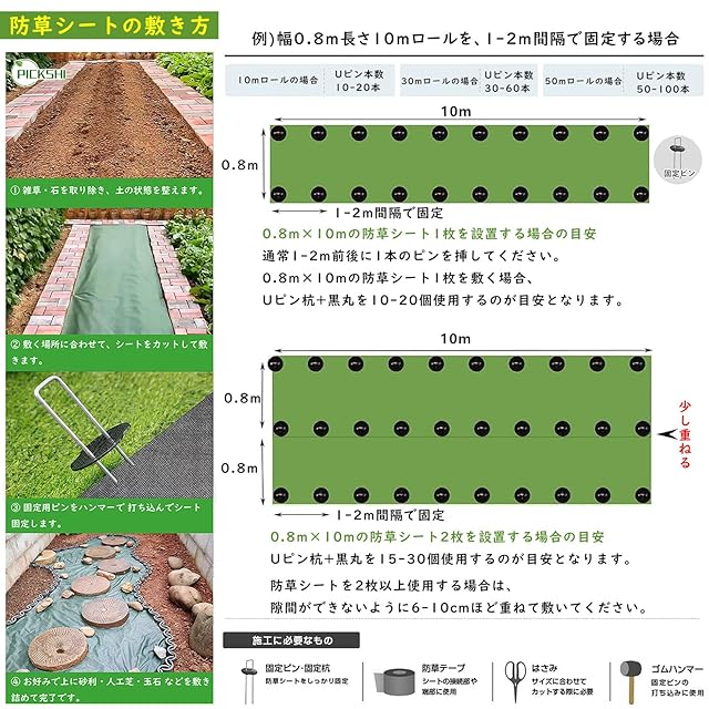 【簡単設置】弊社で販売された雑草防止シートは好きなサイズにカットでき、切断面もほつれにくいので、用途に合った使い方が出来ます。建物周辺(小道、日当たりの良い場所、ツリーデッキ、花壇)、果樹園、菜園、水田、路肩、空き地などに幅広く使用できます。