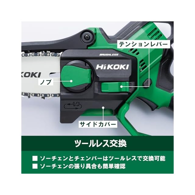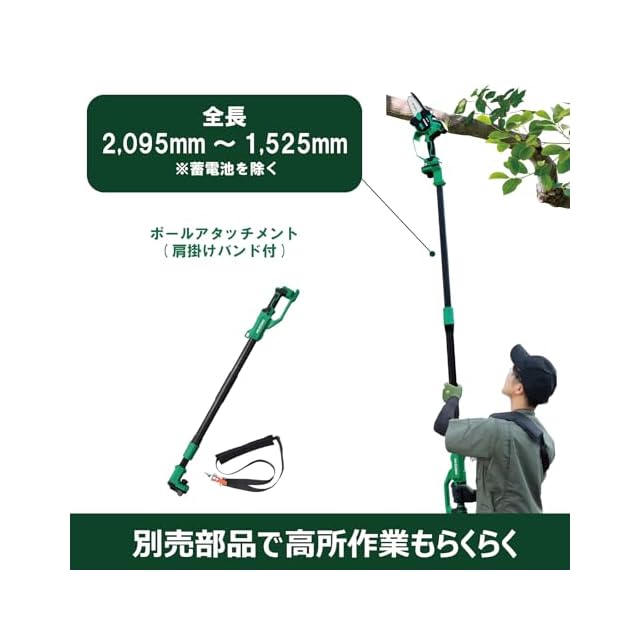 ソーチェンとチェンバーはツールレスで交換可能です。また、別売のポールアタッチメントに取り付けて高所の切断作業も可能です。