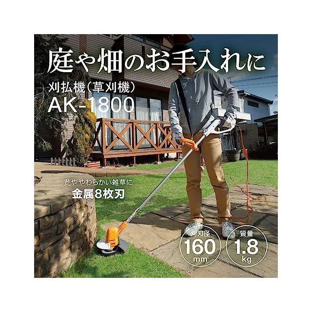 京セラ(Kyocera) 旧リョービ 刈払機 草刈機 AK-1800 697550A 【普通の雑草から密集した雑草刈りに】 キワ刈りガイド付で壁や刃を傷つけないでキワの草をカット 低騒音 長さ140cm 金属8枚刃160mm 延長コード10M 軽量1.8kg | つむぎ屋