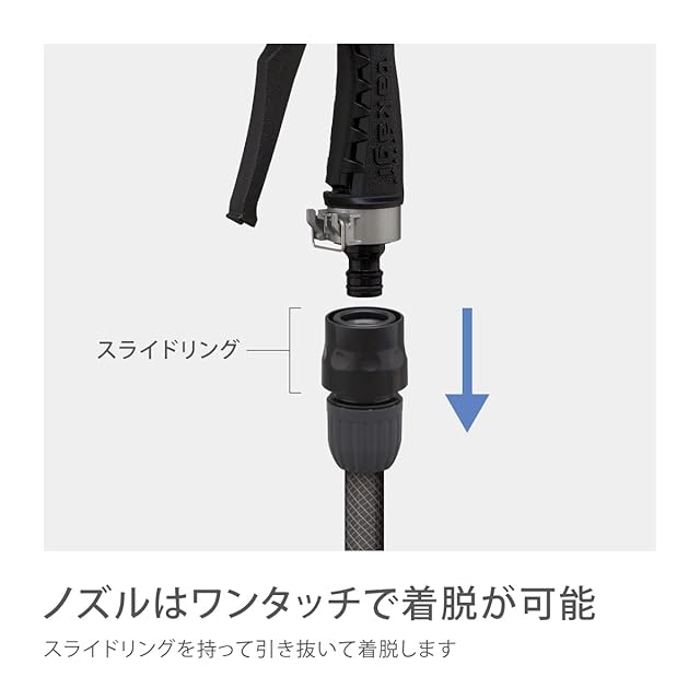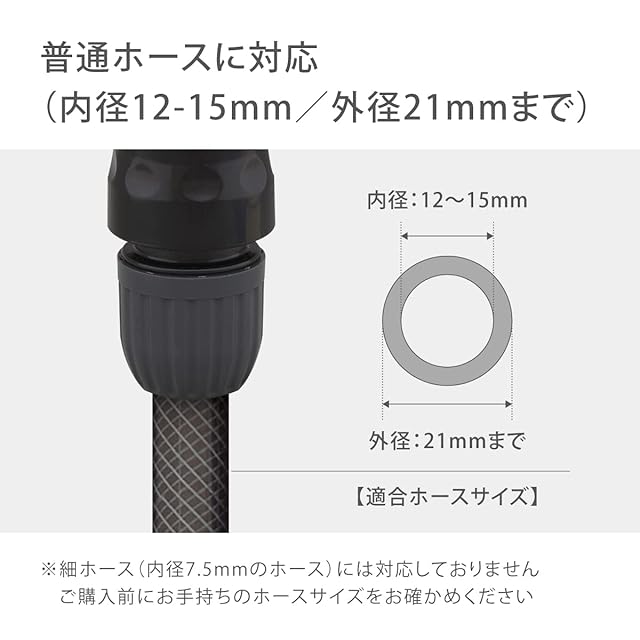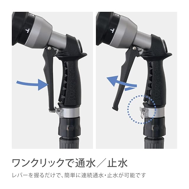 金属の頑丈なノズルでありながら、ラバーグリップで手にフィットする使い心地にもこだわったタフギアメタルノズル。レバーを握ると連動してストッパーがロックされ、通水中の手への負担を軽減。普通ホース(内径12-15mm/外径21mm)に対応。