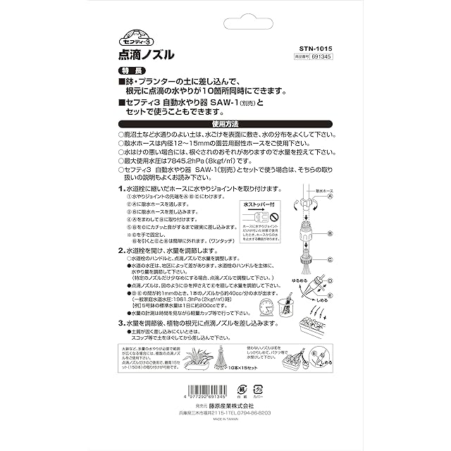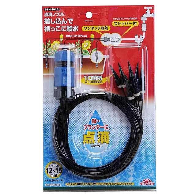 特徴:鉢・プランターの土に差し込んで、根元に点滴の水やりが10ヶ所同時にできる