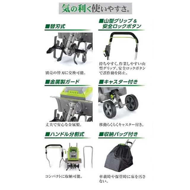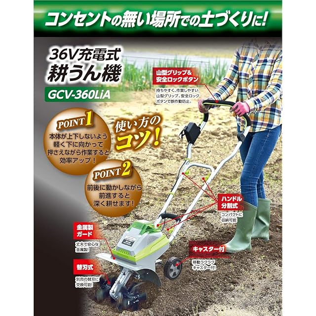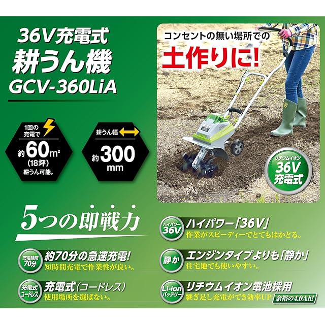 高儀(Takagi) EARTH MAN 36V 充電式耕うん機 GCV-360LiA【エンジンタイプより静か、コードレスで使用場所を選ばない】耕運機 家庭用 充電式 草刈り機 ミニ耕運機 種まき機 電動耕運機 小型 家庭用