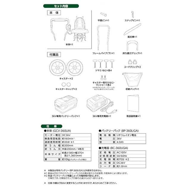 モーター電圧:DC36V、無負荷回転数:約160min-1、連続使用時間:約35分、耕うん幅:約300mm、耕うん刃:外径200mm/4枚刃