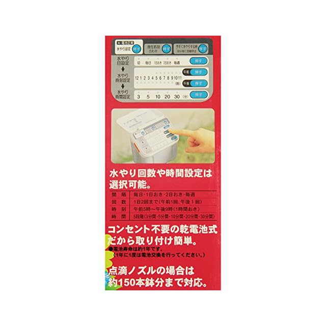 通常・長時間モード共通:(水やり日)なし・毎日・1~30日おき、(水やり回数1日)1~4回、(水やり時刻設定)0~23時(1時間おき)