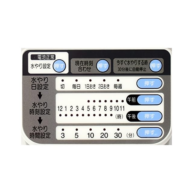 水やり日:4日隔(毎日・1日おき・2日おき・毎週)、水やり回数:2回/日(午前1回・午後1回)、水やり時間:5段階(3分・5分・10分・20分・30分間)