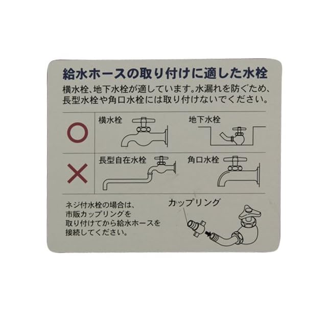 水流量毎分:3~15L(水道圧によってかわります)、適合ホース:内径13~15mm×外径16~20mmの園芸用耐圧ホース