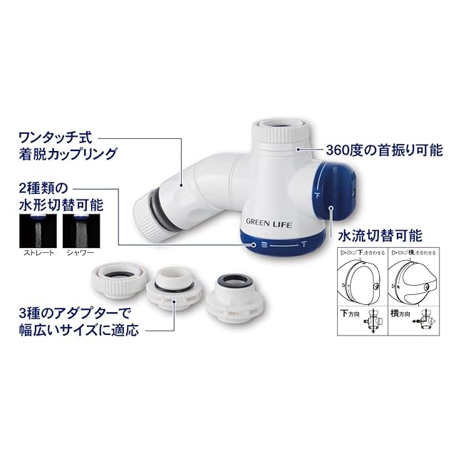【ホース側、蛇口側への切り替えはつまみで簡単操作】青い方向切替つまみで、簡単に水を出す方向(ホース左側、ホース右側、ホース両側、下シャワー側)を切り替えられます。