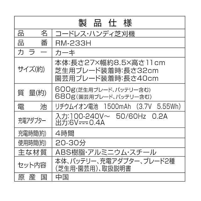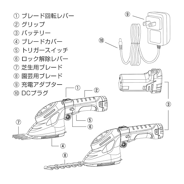 [付属品] 芝生用ブレード・園芸用ブレード・充電アダプター・芝生用ブレードカバー・ローラー・取扱説明書