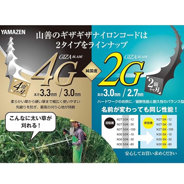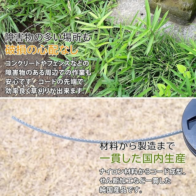 【特徴】切れ味抜群な草刈用ナイロンコードです。ナイロン材料・コード成型・せん断加工などすべて日本国内で行っております。キックバックが起きにくいナイロンコードは安全性が高く、さらに草を粉砕しながら刈り取りを行うので、草刈作業後の草を集める作業を必要としません。刈り取った場所に草が溜まらなければ、刈り具合も確認できるので刈残しも少なく済みます。のこぎり状の刃形状は切れ味抜群で、秋から冬にかけての硬めの草でも高い切れ味を発揮します。