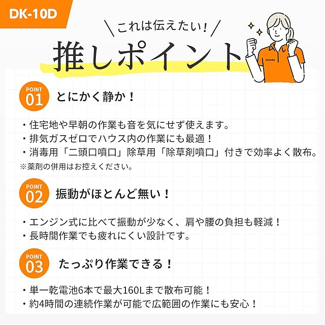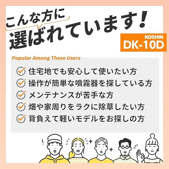 工進(KOSHIN) 背負い式 乾電池 噴霧器 タンク 10L 消毒名人 DK-10D 単一型 乾電池 6本使用(別売) ダイヤフラム ポンプ 消毒 防除 除草 カバー付き 静音 簡単 家庭 | つむぎ屋