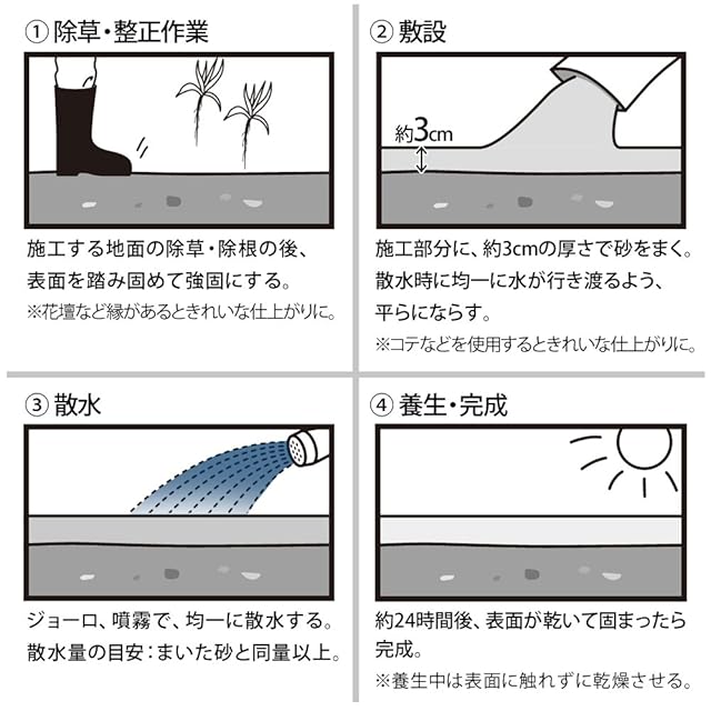 作業方法 : 砂を3cm程の厚みで敷き、水をかける