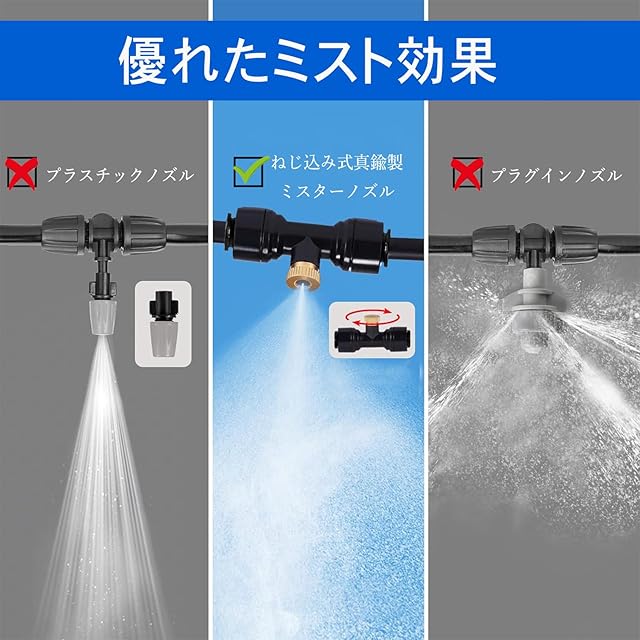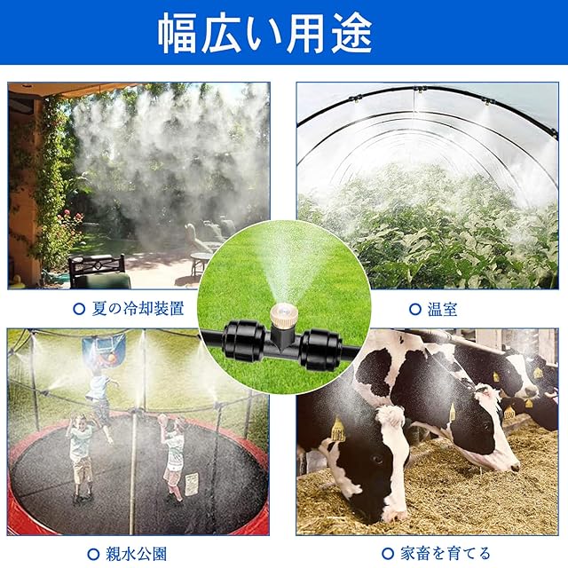 【様々な用途に】植物灌漑、野菜庭、芝生ミスト、冷却システム、冷却システム、塵の除去、ミストシャワー、ガーデン加湿できます。また、扇風機と併用すると小型の加湿器になります!花壇、菜園のような手の届きにくいところにも一度に水やりできます。緑化管理はより便利で省時間・省労力です。