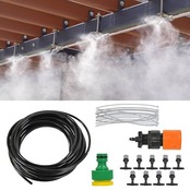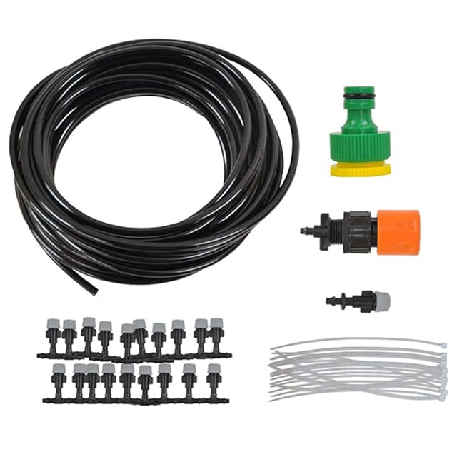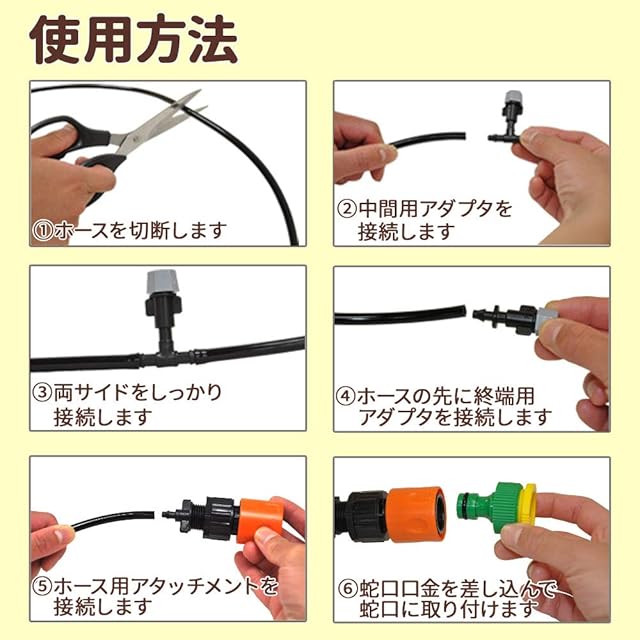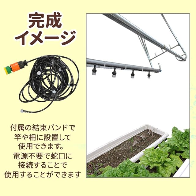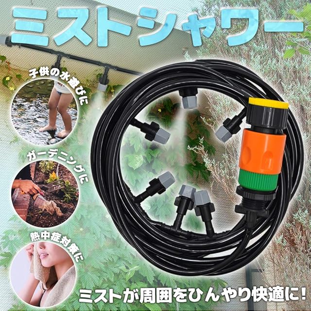 【商品詳細】セット内容:ホース×1、ミストノズル×10(うち1個は先端用)、ホースアタッチメント×1、 蛇口アタッチメント×1、終端用アダプタ×1、結束バンド×10
