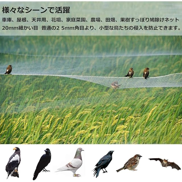 <br>【最適サイズ】幅5m*長さ10m 規格:20mm角目 線径0.35mm カラー:透明 任意サイズカット可能 。最新版防鳥ネットは普通の25mm角目鳩よけネットより、小型な鳥たちの侵入を防止できます。 防鳥ネットは鳩、カラス、ツバメ、雀のような小さい鳥類の侵入を防止でき、静かな家事生活を守れます。鳥の糞害を心配なく、最大の遮断効果を発揮します。愛猫は家から脱走することも防止できます。