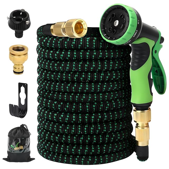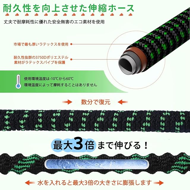 【3倍伸縮可能な天然ラテックス素材】当社の散水ホース は優れた伸縮性の特性があり、水圧をかけるとホースが最大3倍(例:10mから30m)に伸び、使用後は自動的に縮む便利な設計。2mmラテックス内層と超強度外層を採用し、耐摩擦性と耐久性に優れています。-10℃~60℃の環境に適応し、厳しい寒さや暑さに関わらず、オールシーズンご使用いただけます。