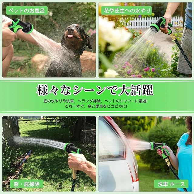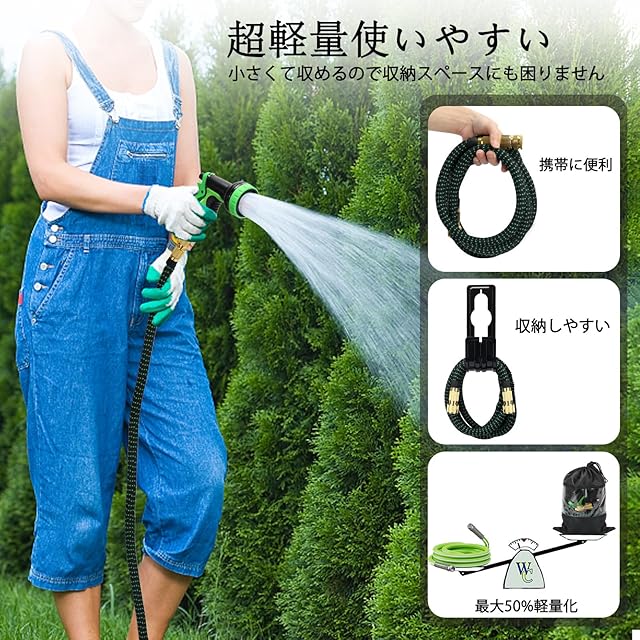 【軽量でお持ち運びやすい】ご使用後、水を全部放水するとホースの重量は軽くなり。従来のゴムホースのような苦労な収納の方法に対し、伸縮ホースは超軽量素材を利用して軽い仕様となっておりますから、誰でも楽にご収納いただけます。また、ホースがねじれることもありません。付属品一式:ホース本体、散水ノズル、多機能コネクタ、収納フック、防水テープが付属しており、すぐにご使用いただけます。