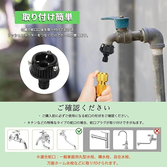 【多機能蛇口コネクター付属】伸縮ホースには標準装備の蛇口用ニップルが組み込まれており、14~18mmの幅広い丸型蛇口に簡単に取り付け可能です。未使用時は同梱のホースリールフックでコンパクトに収納可能。付属のOリングがホースの金属コネクター内部に組み込まれており、漏水防止能力が向上しています。※ホースの長さは水圧によって変化しますので、蛇口の水圧が 0.3MPa 以上の場合、ホースは最大 3 倍の長さまで伸びます 。