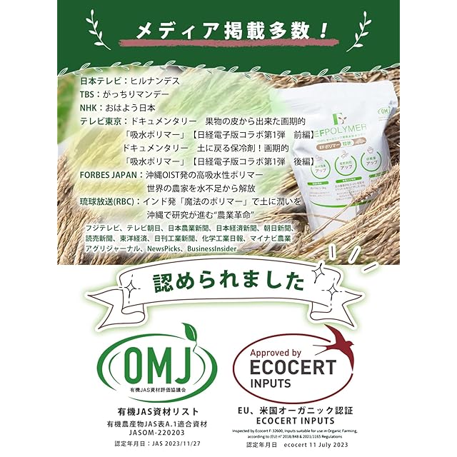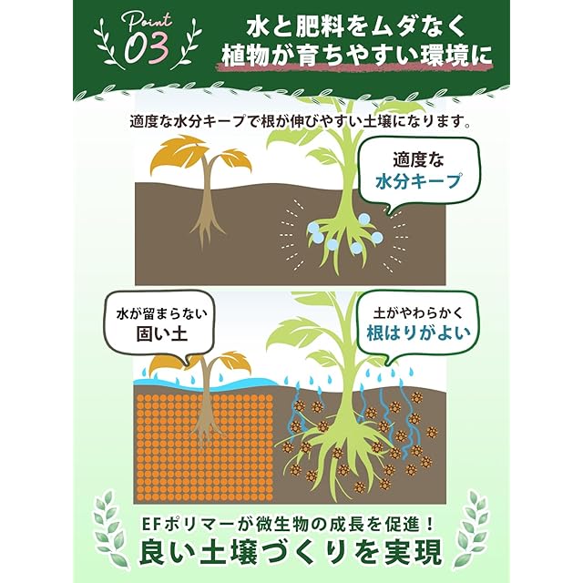 【商品について】● EFポリマーは約6か月間、吸水・放出を繰り返すので水分管理が楽に!●水や栄養剤のムダが減り、土壌の保水力・保肥力を向上!●土壌が改善され、植物が育ちやすい環境に!●オレンジの皮から生まれた、100%自然由来の超吸水性ポリマー(保水材)です。 ●EFポリマーが土に還る過程で、土壌の微生物が活性化され、さらに土が良い状態に。化学物質が残らず環境にも人にも優しい土に!●日本の農家だけでなくフランスやアメリカ、干ばつの厳しいインドなどの地域でも使われています。