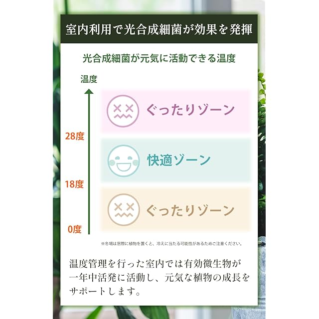 室内利用で効果を発揮:18~28度の環境下で光合成細菌が活発に活動できます。温度管理がされた室内で効果を発揮します。
