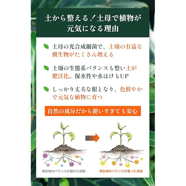 土母について:光合成細菌という微生物のが主成分の植物活性剤です。土壌にいる有益な微生物を増殖させたりバランスを整えることで、植物を元気にします。