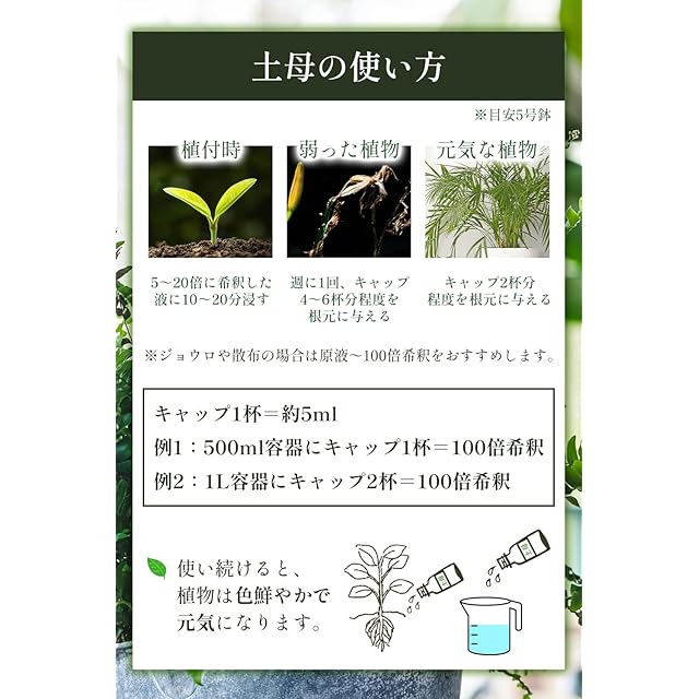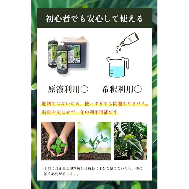 使いすぎても安心:土母は原液でも希釈しても自由に使えます。与えすぎても害はありません。また、基本的には土に使用しますが、植物自体に与えても問題ありません。