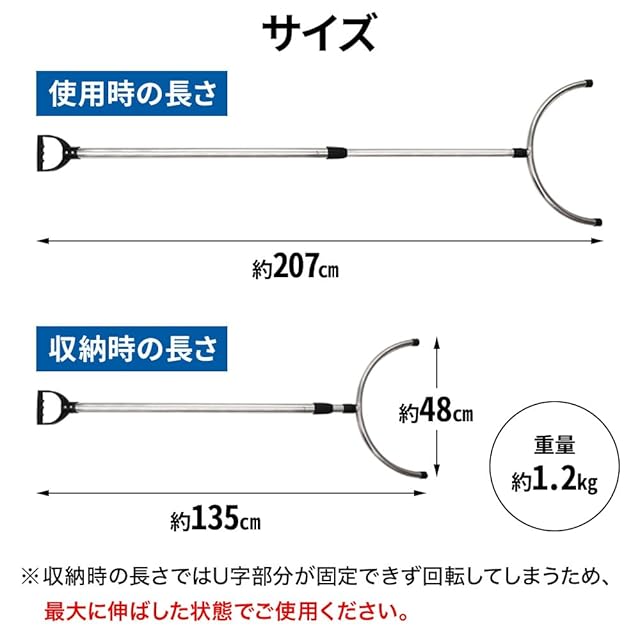 最大207cmの長さに伸縮可能。全長135cmに収納可能なため、店舗や施設の中で保管・管理もしやすい。