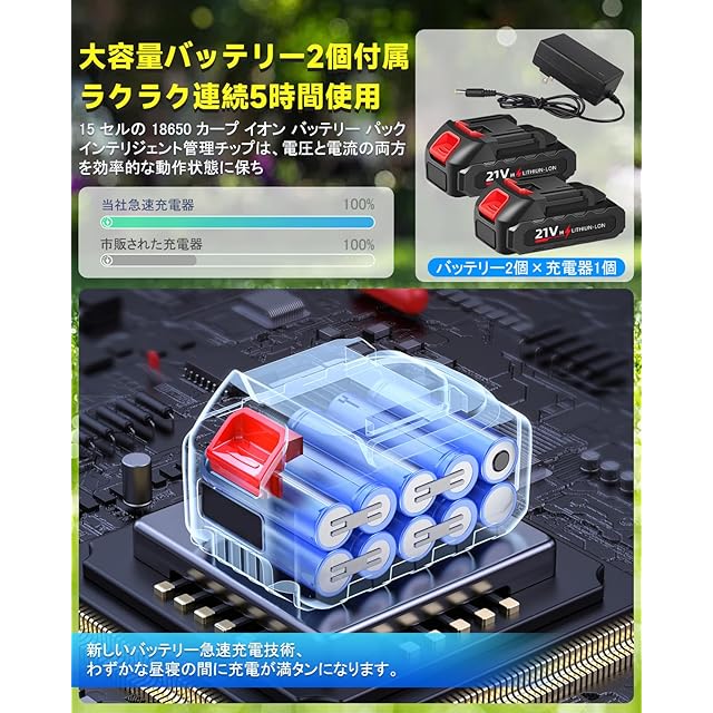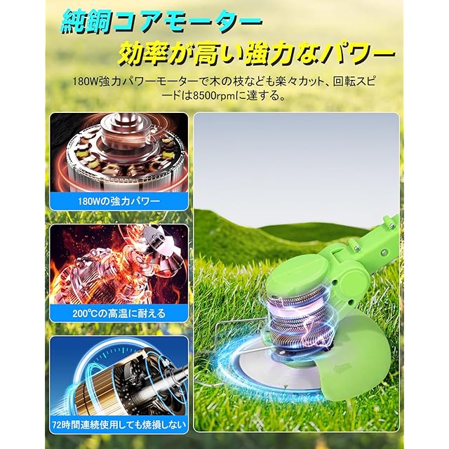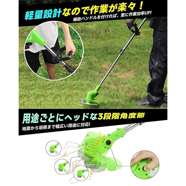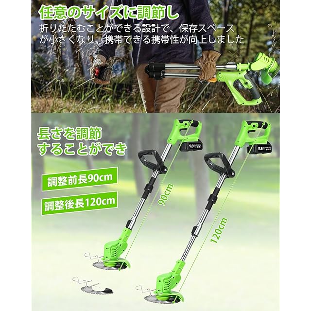 商品名:草刈り機 充電式【鈴木造園会社監修】草刈機 電動 コードレス 1.2kg軽量 小型 低騒音 電動草刈り機 ハンディ 伸縮式 折りたたみ式 18.5V 高効率チップ 純銅モーター 18500RPM 4000mAh大容量バッテリー2個 90° 3段階で角度調整可能 4種類替刃 充電式刈払機 多地形 多機能4in1 芝生/枝切り/草刈り/雑草/植木/家庭菜園 日本語説明書付(Green)