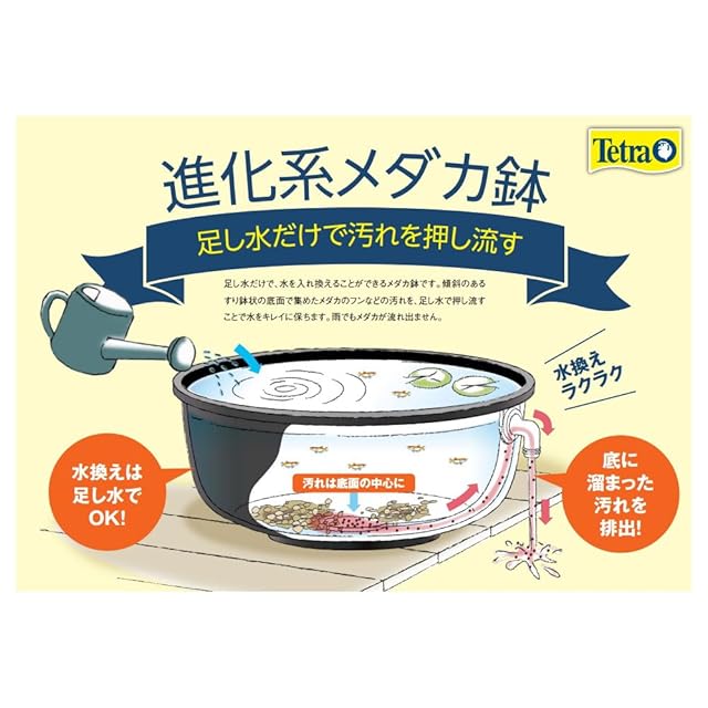 ●斜面状の底面で集めたメダカのフンなどの汚れを、足し水で押し流すことで水をキレイに保ちます。