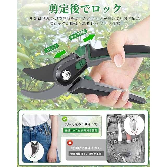 ✅【安全ロック付き】当社の庭鋏は内蔵スプリング設計を採用しており、スプリングの脱落や剪断破壊の発生を効果的に防ぎます。安全ロックは、使用していないときにハサミが誤って開くのを効果的に防ぎ、安全を保護します。ロック設計は、怪我を避けるためにはさみを保管するのにも役立ちます。