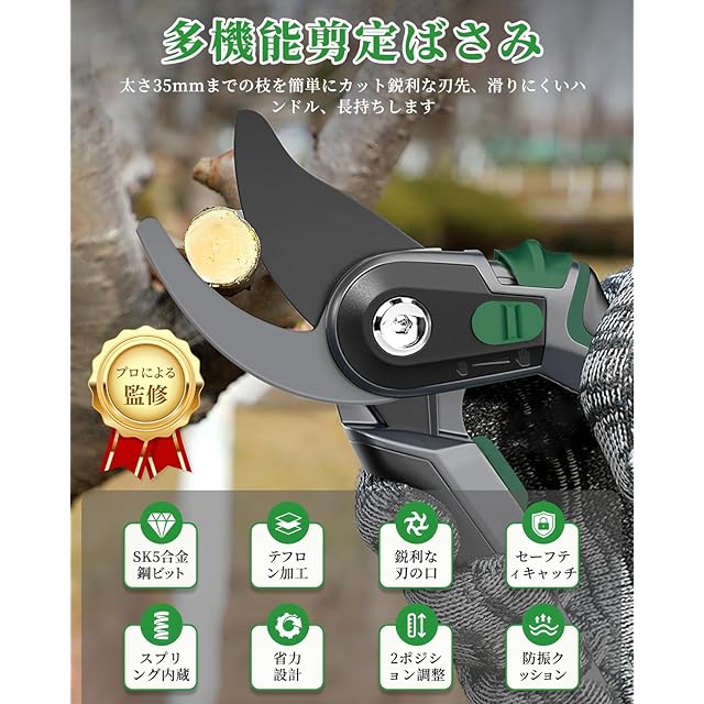 商品名:【2025人気庭師推薦】剪定バサミ Bhgytec 剪定鋏 剪定ばさみ 2段階調節可能 SK85高炭素鋼 アルミ合金 枝切りバサミ 園芸ハサミ 園芸用はさみ 錆びにくい 開口部35mm 軽量化アルミハンドル 握りやすい 果樹 庭木 盆栽 庭園作業 ガーデニング 観葉植物
