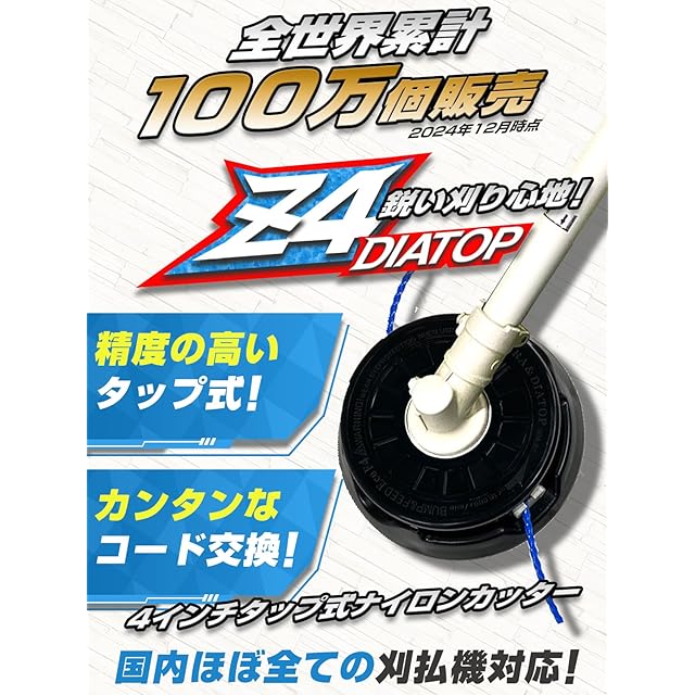 世界で累計100万個販売(2024年12月時点)されたタップ式4インチナイロンカッターです。スタンダードなバランスタイプで鋭い刈心地!①精度の高いタップ式!②カンタンなコード交換!③国内ほぼ全ての刈払い機対応!※チップソーと違って安心・安全 ツイストコードによる静穏性の向上 ツイスト形状により切れ味抜群 部品点数が少なく手間いらず。 ダイアトップはマキタや山善のナイロンカッターの製造元です!Z4は手軽で人気なタップ式で特に精度の高い造りになっています! ナイロンコードの交換も超簡単で約30秒で可能です!本体からの取り外しはもちろん不要。パーツはたった3つのシンプル構造です。 国内ほぼ全ての刈払い機対応!取付け部が丸穴タイプのため、国内ほぼ全ての刈払機に取り付可能です。 刈れる草は・芝生(グラウンドカバー)・低木(ツツジ、サツキ、ヒイラギナンテン、ボケ、アベリア等)・雑草(スギナ、オオバコ、ドクダミ、カラスノエンドウ、ハコベ、ヨモギ等)です。 刈れる場所は・フェンスの際・隙間の草・コンクリートの際など様々なシーンで利用可能です。 【本体仕様】 ・本体タップ側を地面に叩きつけることでコードを任意の長さに調整することができます。(タップ1回あたり20mm~30mm程度) ・本体サイズ:直径 約11cm×高さ 約5cm/本体重量 約180g/ 取付け穴 直径 約12.3mm/取付け部:25.5mm/使用工具径26.4以下 エンジン式刈払機対応 【その他】 ・直径換算で3.4mm以下のナイロンコードを使用ご使用ください。 ※EX10用ツイストナイロンコード 2.7mmまたはEX12用ツイストナイロンコード 3.0mmを推奨します。