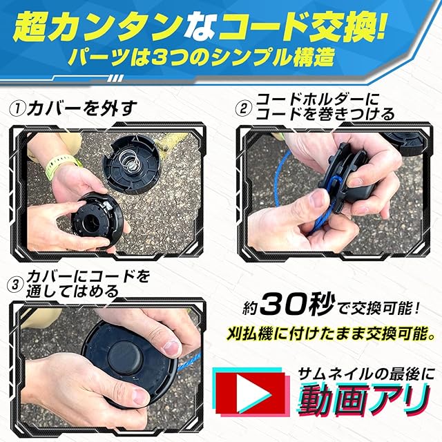 ②カンタンなコード交換:ナイロンコードの交換も超簡単で約30秒で可能です!本体からの取り外しはもちろん不要。パーツはたった3つのシンプル構造です。