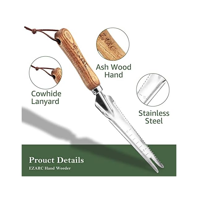 商品名:EZARC 草むしり道具 雑草抜き 根こそぎ 5in1多機能ツール 目盛り付き 防錆 ステンレス 木製ハンドル 片手用 除草道具 芝生 庭 農場 園芸用品