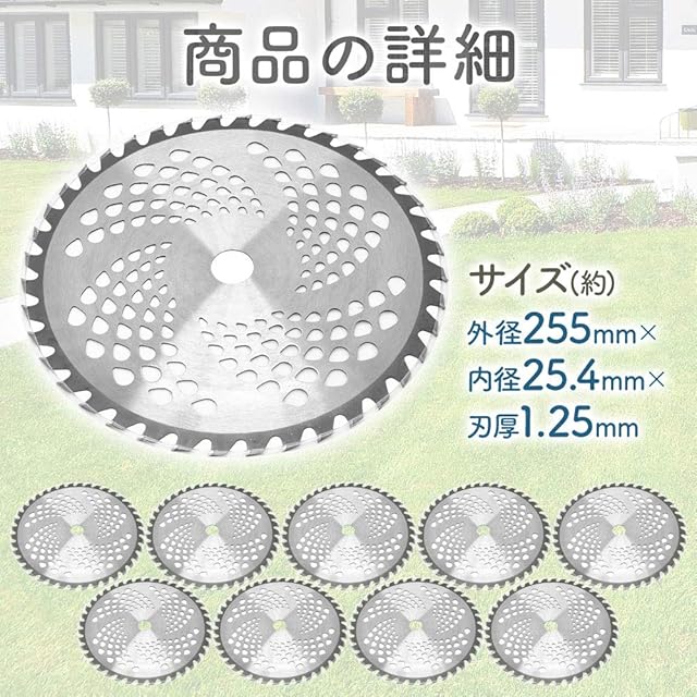 一般的な外径255m、刃数40Pの草刈機用替え刃をお得な10枚セットにしました!いつでも綺麗な刃で草刈りをすることができます。