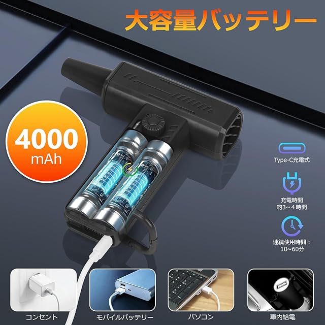 ▼ストレスフリー設計【大容量バッテリー&急速充電】 多機能ブロワーには4000mAh大容量バッテリーを搭載し、微風で最大60分の連続稼働を実現。フル充電たったの4時間で、家庭用コンセントはもちろん、USB Type-C対応のモバイルバッテリーでも充電可能。車内充電機能でアウトドアや緊急時も安心です。