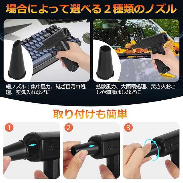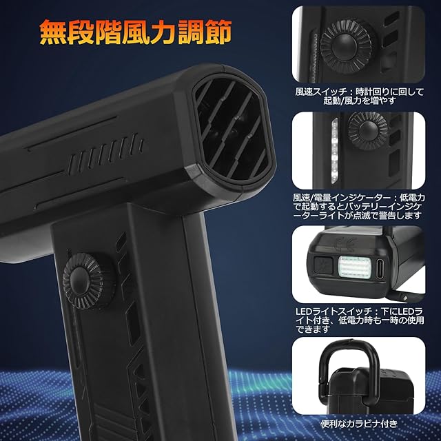 商品名:エアダスター 電動エアダスター ブロワー 150000RPM回転数 最大風速約70m/s 無段階風量調整 TypeC急速充電 4000mAh大容量バッテリー 充電式 小型 2種類ノズル付き 清潔ブラシ10枚付き LEDライト ほこり掃除 PC/キーボード掃除 車内清掃 空気入れ 焚き火おこし 日本語取扱説明書付き (ブラック)
