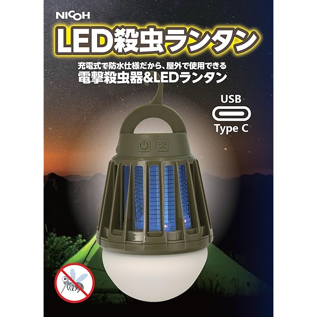 ニコー(NICOH) LED殺虫ランタン/USBタイプC充電 電撃殺虫器 & 照明ランタン の1台2役! NCS-3000LN オリーブグリーン色 充電式 防水 仕様 だから 屋外 での使用が可能 アウトドア キャンプ レジャー に最適 USB C