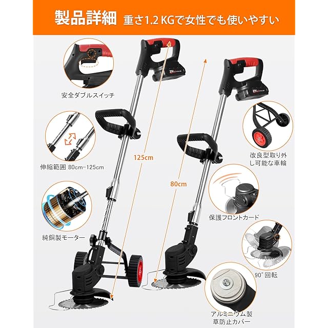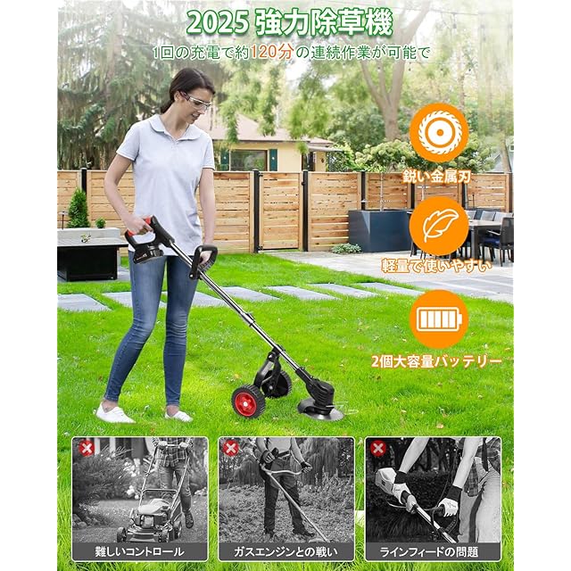 商品名:草刈り機 充電式草刈機 【2025革新&超高速モーター搭載】sunsery コードレス 21V 6500mAh大容量 18000rpm ナイロンカッター 伸縮&角度調整 枝切り 植木 雑草 充電式刈払機 4種類の刃&替刃 3段階で角度調整可能 軽量 枝切り 芝生 敷地 畑 雑草 植木 農業家庭用芝刈り機 日本語説明書付 (ブラック、補助輪付き)