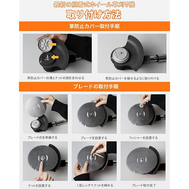 【パッケージリスト】芝刈り機本体*1、バッテリー*2、充電器*1、保護ゴーグル*1、手袋*1、円状の刃物*4、菱形の刃物*5、プラスチック製刃物*10、ナイロン製のひも*5、取っ手*1、衝撃防護力バ一*2、保護力バ一*1、スパナ*1、日本語取扱説明書*1。ご購入またはご使用中に何か問題が生じた場合は、どうぞお気軽にお問い合わせください。 注意: モーターが発煙するのは正常です。これは高温のモーターに草汁が入ることが原因です。使用を続ける前にモーターが冷えるのを待ってください。