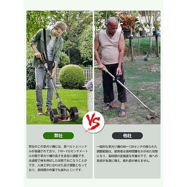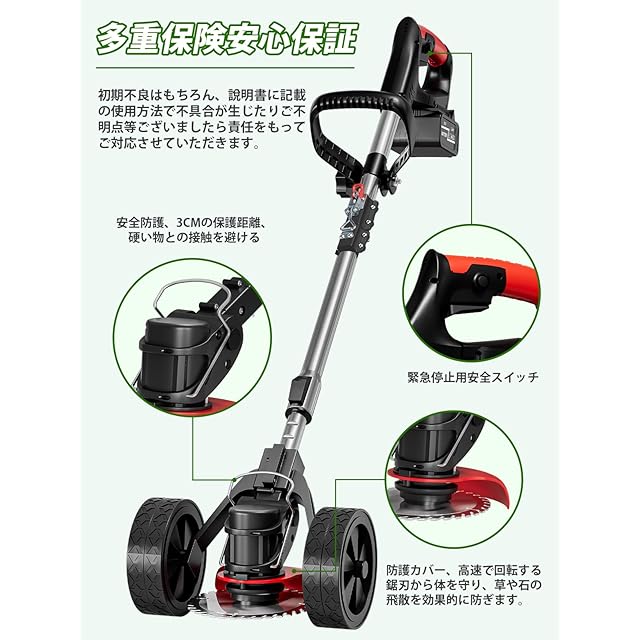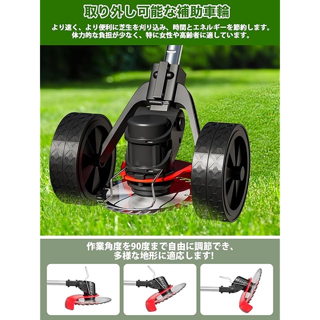商品名:草刈り機 充電式 コードレス 【2025最新型】草刈機 大容量バッテリー2個搭載 残量表示 3時間運行 マキタ18Vバッテリー対応可能 電動草刈り機 充電式草刈り機 安全 軽量 低騒音 角度調整 伸縮可能 4種替刃 肩掛けバンド 補助輪 芝刈り機 多地形対応 除草 枝切り 雑草 芝生 畑 植木 家庭用 農業園芸用 刈払機 日本語説明書付き