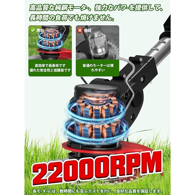 【2025年最新モデル・充電式草刈り機】Moonelのこの充電式草刈り機は最先端の技術を採用されており、高品質で高回転数の純銅モーターを搭載しています。従来の草刈機と比べて、回転数が30%向上しており、無負荷時の最高回転数は毎分22,000回に達します。このような強力な動力で、雑草の刈り取りはもちろん、庭の低木や枝も簡単に切断できます。芝刈作業がより簡単になり、疲れを軽減し、作業能率を大幅に向上させます。無線式のため、コードの制約がなく、操作が簡単で、女性や高齢者にも使いやすいです。また、省エネで低騒音なので、周囲の近所に迷惑をかけることもありません。