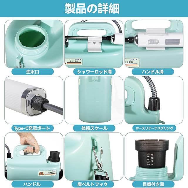 商品名:噴霧器 電動 EIANLON 充電式 自動噴霧 6L ポータブル除草剤 噴霧器 内蔵4000mAhバッテリー 散布 除草 防除 肩掛け 手持ち ボディラインにフィット 3つのノズル 伸縮式パイプ 延長パイプ USBケーブル typeC 付属 日本語取扱説明書