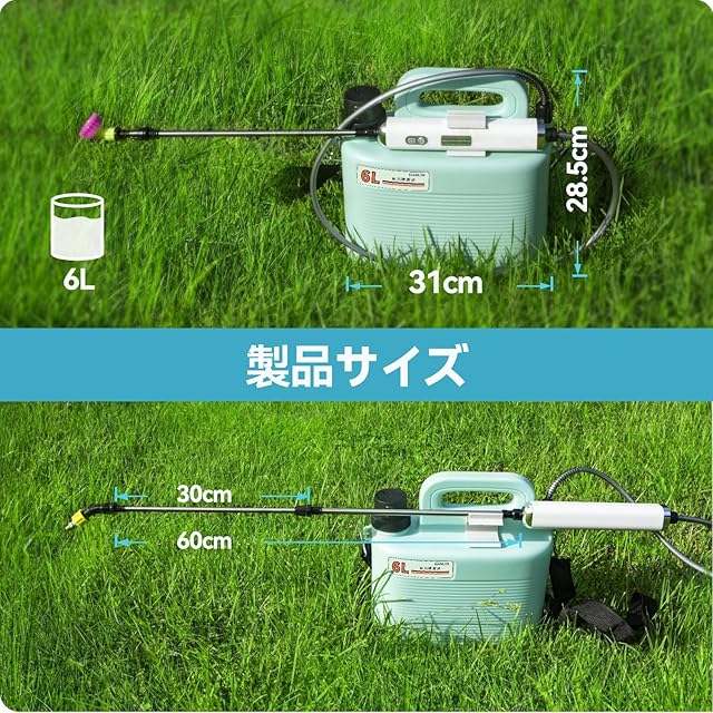 EIANLON バッテリー式噴霧器 6 リットル、3 つのノズル付き電動噴霧器、USB 充電ハンドル、(30CM+30CM) 伸縮ポール、調節可能なショルダーストラップ付きの庭用噴霧器、芝生、庭、掃除に適しています。 半透明のタンクスケールにより、液体の残量を簡単に監視でき、当社の芝生噴霧器は簡単に取り外して洗い流すことができるので、メンテナンスも安心です。 6 リットルの大容量噴霧器には、自吸ポンプが備わっており、最長 3 時間ノンストップで噴霧できるため、ガーデニングの水やりが簡単かつ効率的になります。