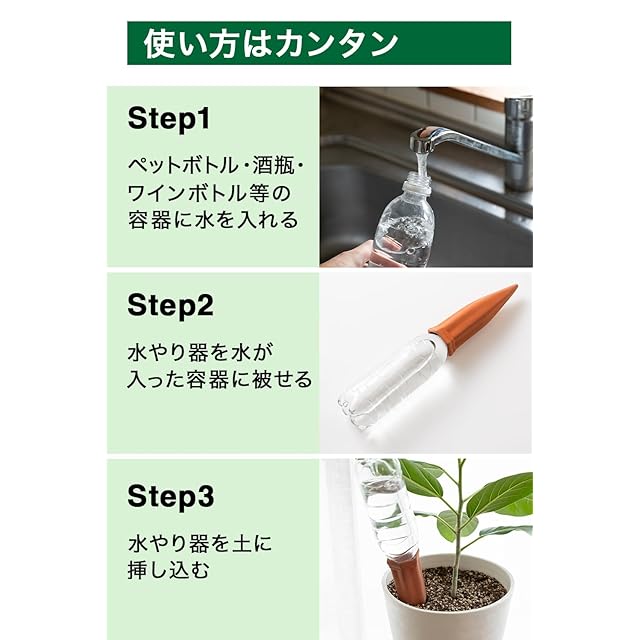 ✅【使い方はカンタン!】Step1.ボトル(ペットボトル・酒瓶・ワインボトル等)に水を入れます。Step2.水を入れたボトルに水やり器を被せます。Step3.水やり器を土に挿します。