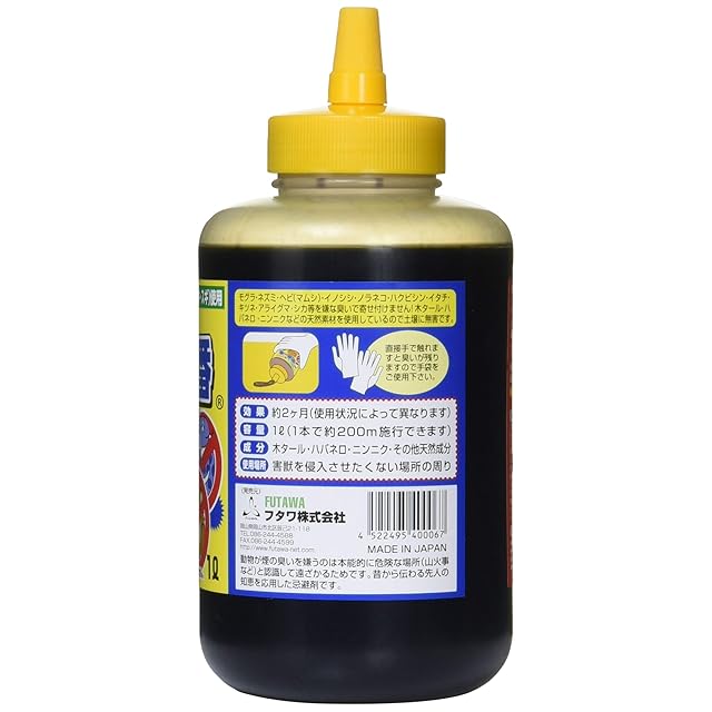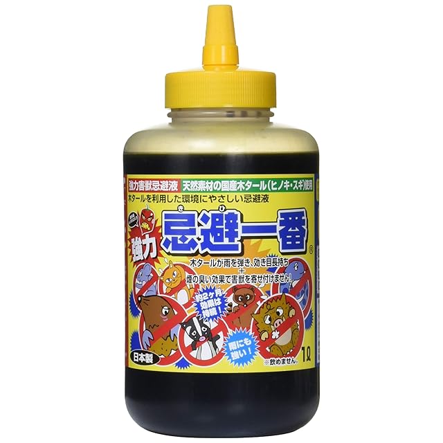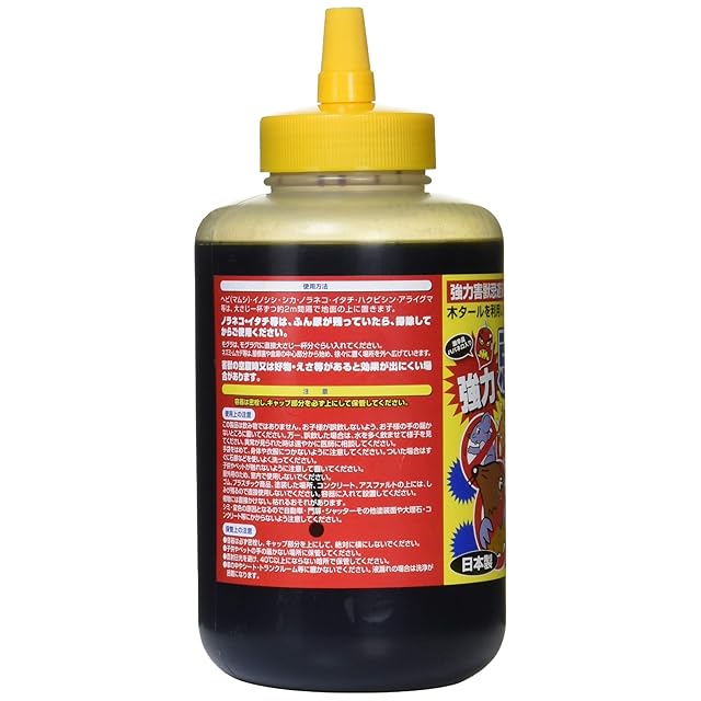 ●害獣を嫌な臭いで寄せ付けず、原液木タール、にんにく、その他天然素材を使用してるので土壌に無害です。●【用途】●モグラ、ネズミ、ヘビ、ノラネコ、イタチ、キツネ等を避け。●【機能・特徴】●動物が煙の臭いを嫌うのは本能的に危険な場所(山火事など)と認識して遠ざかるためです。昔から伝わる先人の知恵を応用した忌避剤です。●【仕様】●効果:約2ヶ月(使用状況によって異なります)。●容量:1L。●約200m施行。●【材質】●木タール・木酢液・ニンニク・その他天然素材。●【商品サイズ】●幅95×高さ220×奥行95mm 重量1130g●【注意事項ほか】●手袋をはめて身体や衣服につかないように注意して下さい(ついた場合はすぐに石鹸などを使いよく洗ってください)。絶対に飲まないでください。子供やペットが触れないように注意しておいてください。屋外用のため室内で使用しないでください。コンクリートやアスファルトの上には、しみが残るので直接使用しないで容器などに入れて使用してください。