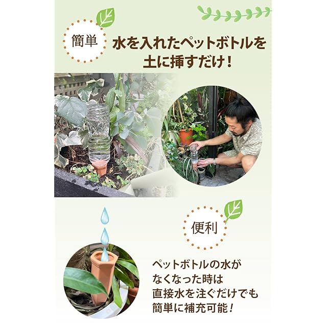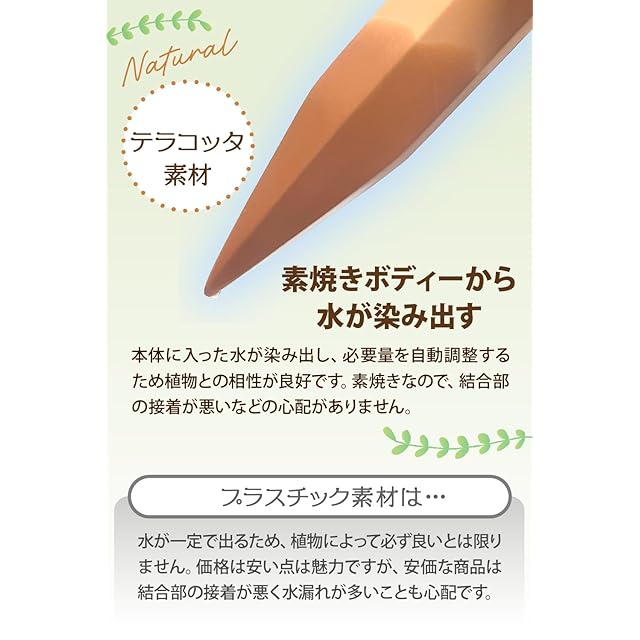商品名:自動水やり機 (4本セット)【植物育成のプロW監修】土に挿すだけで使用可能x素焼きテラコッタ製xペットボトルで使用可能