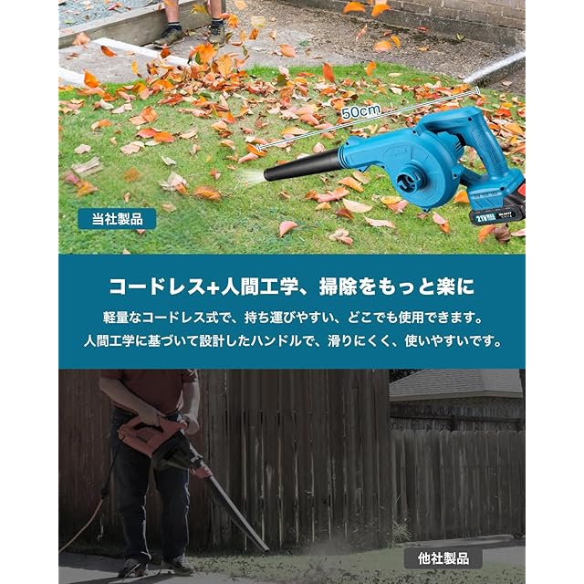 【コードレス&軽量】バッテリー給電、コードレスの充電式なので、持ち運びやすくて、電源コンセントに接続する必要がありません。本体の重量はわずか1.2kgで、女性にも扱いやすいアイテムです。コードレスのブロワですので、場所を選らず、さまざまなシーンで大活躍します。軽量な設計で、ノズルが取り外しできるので、収納も簡単です。