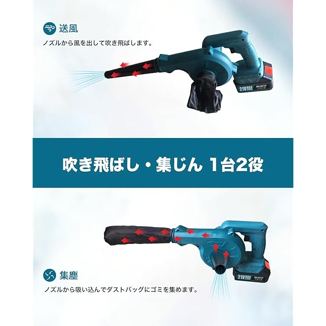 ブロワー 充電式 バッテリ一*2付き 強力 ブロワバキューム コードレス 吹き飛ばしと集塵1台2役 軽量 コンパクト 小型 ミニ 園芸設備 落ち葉 掃除機 庭掃除 洗車 清掃 集塵 取扱説明書付き