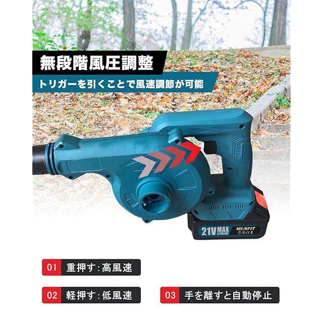【無段階風圧調整】トリガーを引くことで風速調節が可能、操作は簡単(重押す:高風速、軽押す:低風速、手を離すと自動停止)。無段階トリガーで作業内容や環境によって、ブロワの風量の調整することができます。