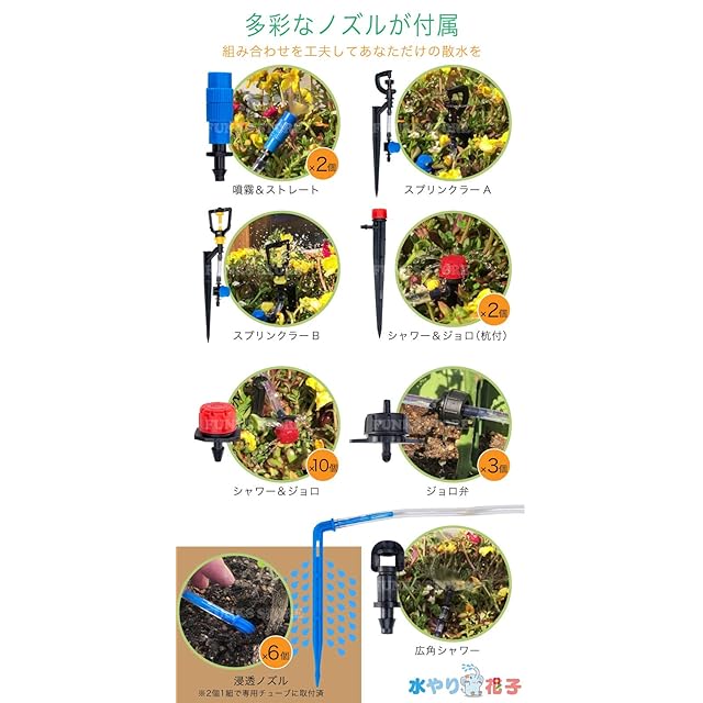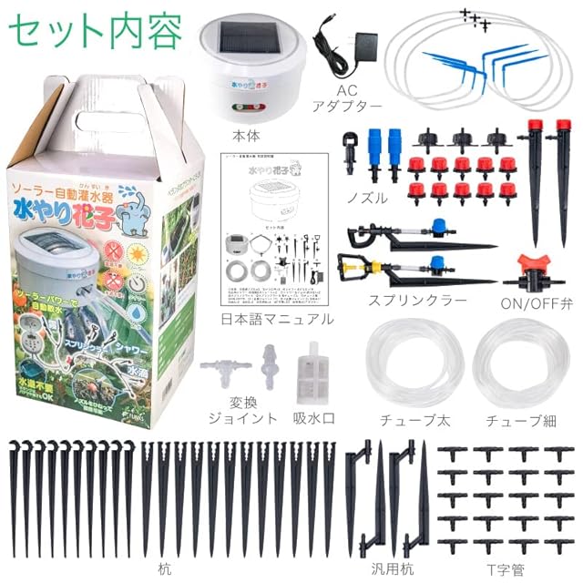 セット内容:本体、ノズル類(8種26個)、ON/OFF弁、チューブ太(外径9mm、内径7mm)、チューブ細(外径6mm、内径4mm)、吸水口、変換ジョイント、杭(2種22本)、汎用杭(4本)、T字管(20個)、日本語マニュアル、ACアダプター